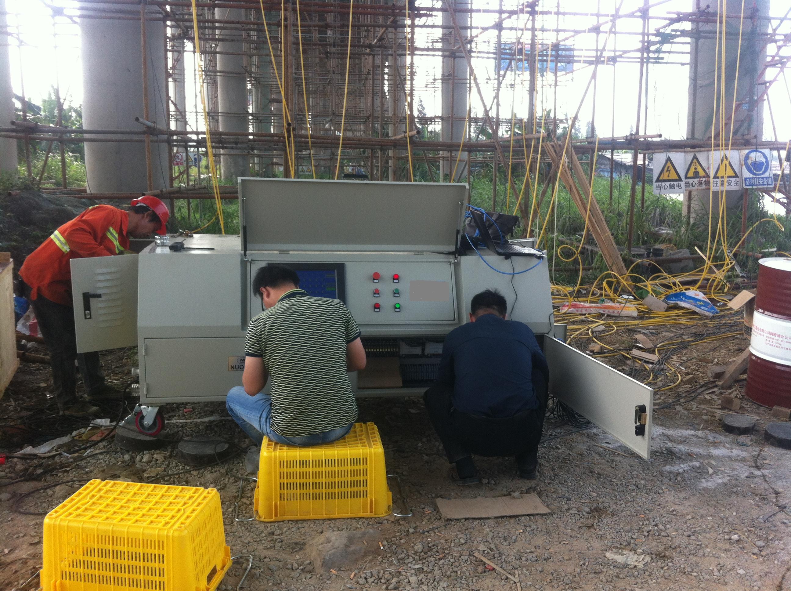 2012年我公司为该桥梁提供智能连续千斤顶同步系统。经过精科液压技术团队与工程技术人员经过多次技术交流结合大桥特点采用基于液压传动、计算机控制及现场总线技术---智能连续千斤顶同步系统,通过采用自动连续顶推千斤顶,自动连续顶推泵站及PLC主控台,主控台对各泵站及千斤顶进行集中控制,保证所有千斤顶启动、施力、运行同步。在岸侧设置顶推平台、顺桥至对岸设置多个临时桥墩,在每个临时墩左右两侧各安置一套顶推装置。各个顶推装置有独立的液压泵站提供动力、由独立的分控制器实施前端控制,并通过现场总线与主控制器通讯。顶推装置在计算机系统的同一控制下,调节各个支墩的高度、根据支撑力的大小实现顶推力和速度的综合控制,确保各个支墩的顶推力与其摩擦力相应。